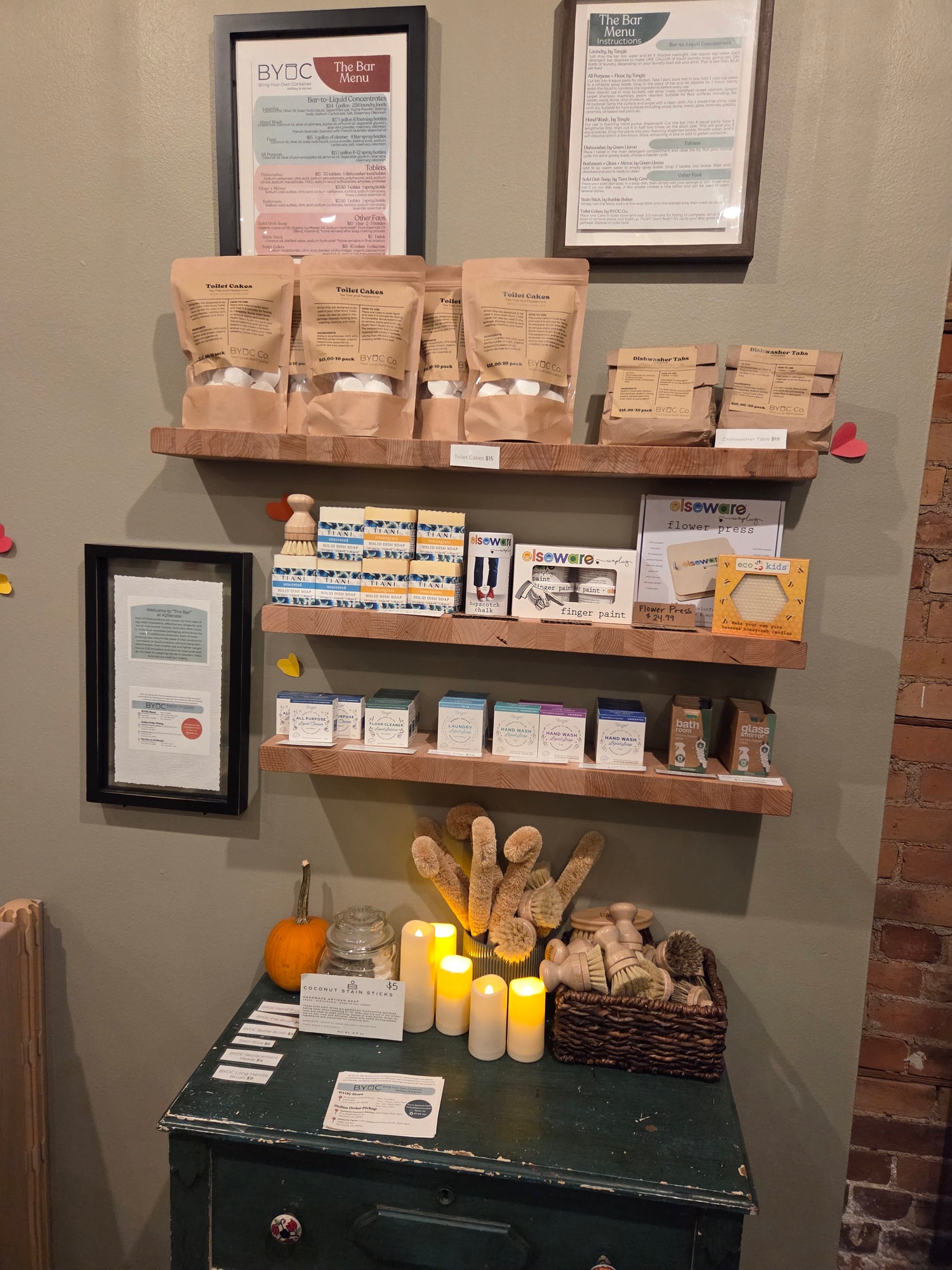 The Bar is located within Recess Work & Play Cafe, featuring select products. Each product is selected for its ease of use, clean ingredients, effectiveness, longevity, and low environmental impact. Solid bars feature minimal or recyclable packaging, reducing CO2 emissions and enhancing portability. They eliminate the need for weighing liquids or powders, are water-efficient in production, and maintain full effectiveness. From All Purpose Cleaner, to Laundry Detergent, to Dishwasher Tablets. Snag